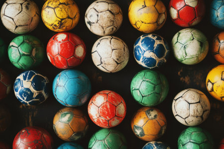 A close-up shot of a colorful array of sports balls, such as soccer and basketballs, artfully arranged against a blurred background of other sporting goods. --ar 3:2 --v 6 Job ID: 7cb79b59-4a43-4881-8ecd-731381c1aad4