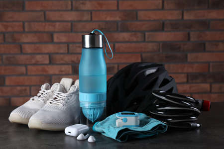Essential fitness gear for a productive workout session, laid out neatly on a grey surface