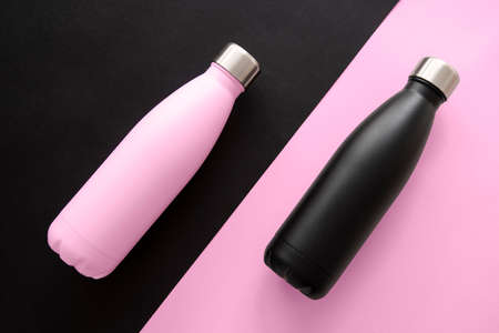 Colorful reusable steel thermo water bottles, isolated on white background Say no to plastic disposa