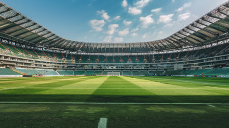 A captivating view of an empty stadium featuring a vibrant green field and colorful seating. Ideal for sports-related projects and urban architecture themes.