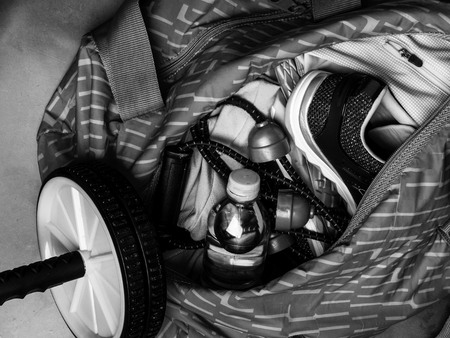sport bag with fitness set, shoes, expander, roll for press, motivation and health lifestyle concept