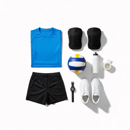This image showcases a visually appealing arrangement of sport-related apparel and equipment on a light blue background, perfect for promoting active lifestyles.