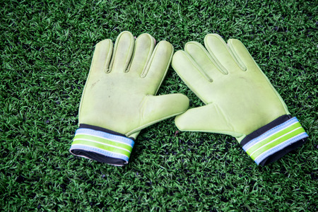 goalkeeper gloves in the grass on the football field