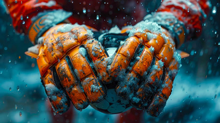 Hands goalkeeper. Gloves closeup. sitting on the bench