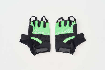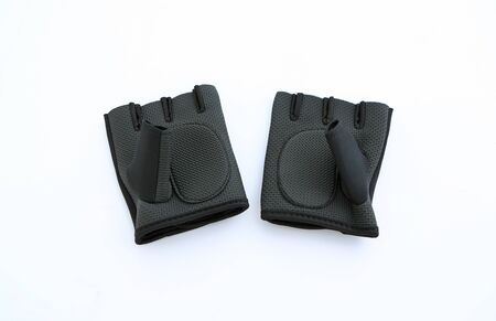 Fitness gloves use for training at gym or fitness center isolated in white background, workout routine protecting hands when lifting weight, has copy space, sport equipment, healthy lifestyle concept.