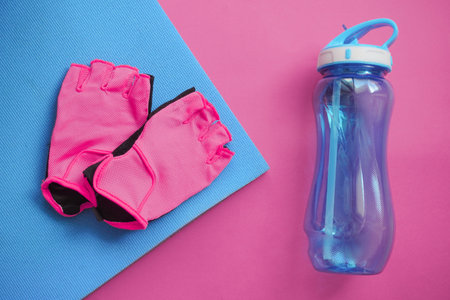 Flat lay pink sports Weight Training gloves for a Bicycle or gym lie on a blue background. Reusable blue water bottle on a blue background. Concept of sports and healthy lifestyle. Jogging or yoga