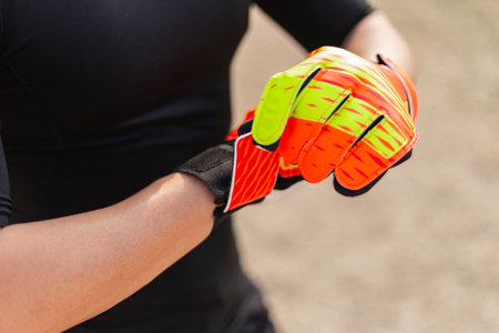 Male keeping his hands in protective black gloves together while standing at the stadium