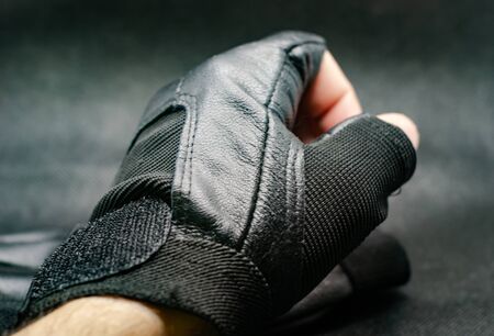 Man's hands put on sports gloves for a gym