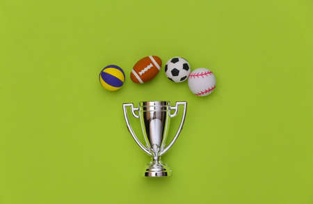 Mini balls of different sports and champion cup on green background. Minimalism Sport concept. top view. flat lay.