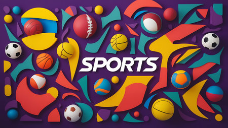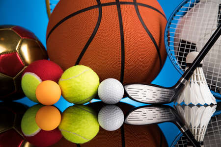 Sport equipment and balls, stadium background