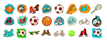 Sports cute stickers set in flat cartoon design. Bundle of basketball, baseball, football, bowling, skating, tennis, running, cycling and other. Vector illustration for planner or organizer template