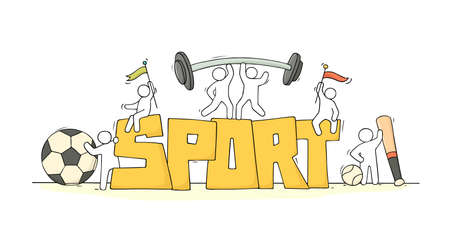 Sketch of working little people with word Sport. Doodle cute miniature scene of active men. Hand drawn cartoon vector illustration for lifestyle design.