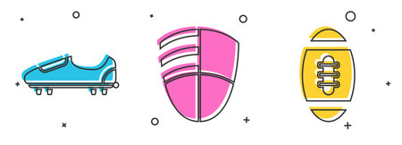 Set Soccer or football shoes with spikes, Football club logo template and American Football ball icon. Vector