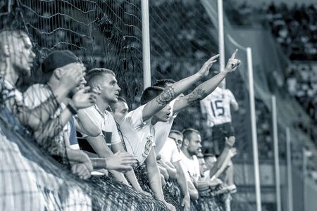 ODESSA UKRAINE - July 28, 2019: spectators at stadium. Crowds of fans in stands of football stadium during match Shakhtar (Donetsk) -Dynamo (Kiev). Grandstand with fans. Stands with football fans