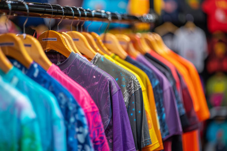 Vibrant T-shirts on street market rack with abstract blurred background.