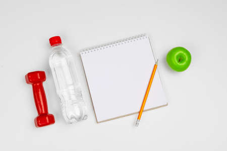 top view of sport equipment, measuring tape, alarm clock and notebook near diet food and water on white background