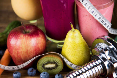 delicious fresh fruit are on the table with weight and bootle