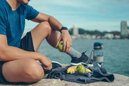 Healthy man hold apple fruit and sitting on the stone near the beach.