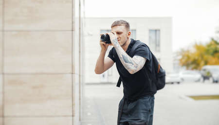 Attractive man making photos outdoors at cityscape background
