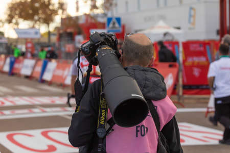 Ejea de los Caballeros, Spain - October 23, 2020: Journalists, photographers and media, working in the finish line area of the fourth stage of La Vuelta a España 2020.