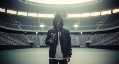 Portrait of a hacker wearing a mask and holding a camera while standing in front of a large football stadium