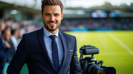 A confident male photographer in a suit smiles while holding a camera on a vibrant sports field, capturing the excitement of the game with a determined expression.