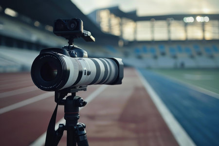 Professional camera on a tripod is recording a sports event in a stadium