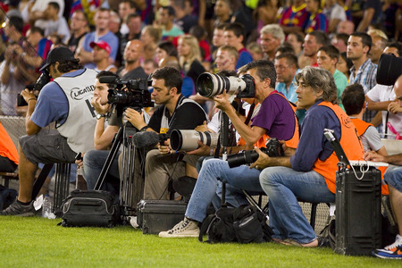 Sport journalists working at the Spanish Super Cup final match between FC Barcelona and Real Madrid, 3 - 2, on August 17, 2011 in Camp Nou stadium, Barcelona, Spain