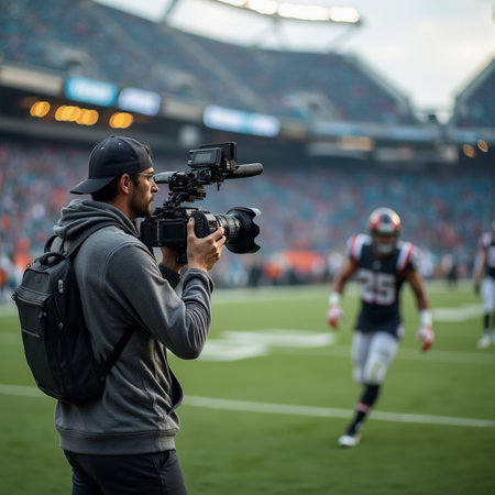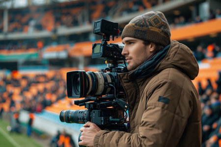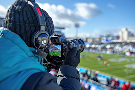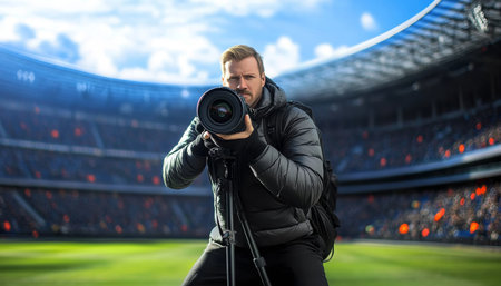 Sports cameraman capturing the action on the pitch, with vibrant lights of stadium illuminating players and the roaring crowd.