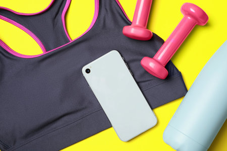 Stylish sports bra, dumbbells and smartphone on yellow background, flat lay