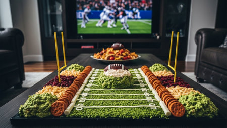 A cinematic, low-angle wide shot (16:9 aspect ratio) capturing a gourmet Super Bowl party spread. Th