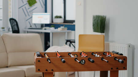 Empty business office used for after work meeting with drinks. Nobody in corporate workplace with foosball table to play soccer game. Space to do fun activity and entertainment after hours