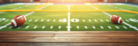 Football field with two footballs positioned before a game at sunset in a stadium environment