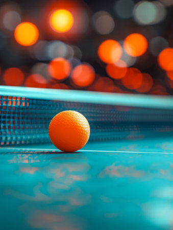 Capture the vibrant hues in this breathtaking close-up shot of an orange ping pong ball resting majestically on a blue table tennis table The ethereal bokeh lights suspended in the background illuminate the scene, creating a captivating aura of playful curiosity This image embodies the essence of lively competition and the unexpected beauty found within the ordinary AI Generative