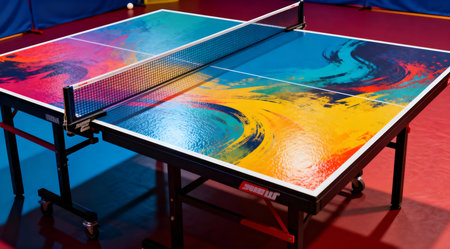 The image features a ping pong table with a surface adorned in a kaleidoscope of vivid colors, including electric blue, fiery orange, and neon green. The design incorporates abstract geometric patterns, enhancing the table's artistic appeal. This visually striking sports art piece is ideal for modern sports facilities or as a unique decorative element in contemporary interiors. AI-generated illustration.