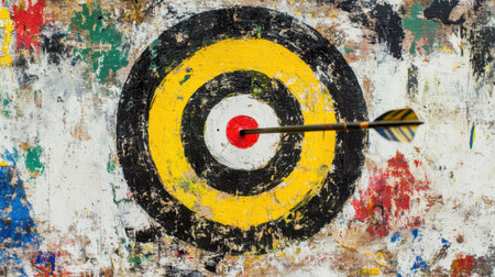 Vibrant target board with bold colors, featuring red bullseye and arrow striking center, symbolizes focus and achievement. contrasting background enhances visual impact