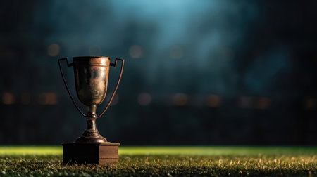 Shiny trophy stands proudly on lush green field, illuminated by soft blue lighting, symbolizing victory and achievement in sports. atmosphere is filled with anticipation and excitement
