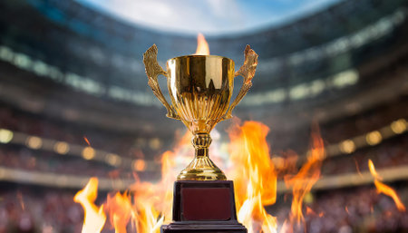 A stunning image of a winner's trophy surrounded by vibrant flames, set against a blurred background, symbolizing passion, success, and celebration. Perfect for motivational, sports, and