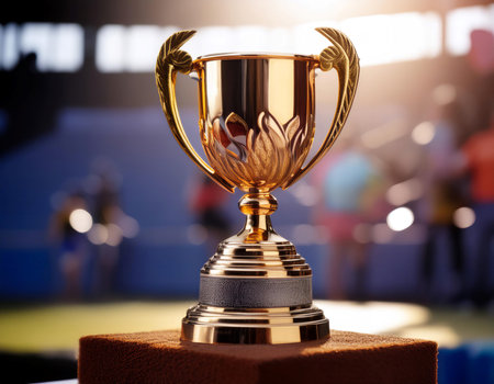 A close-up view presents a shiny golden trophy cup, prominently displayed against a backdrop of blurred stadium lights. The cup gleams with a polished texture, set in a dynamic composition. It suggests themes of competition and success within a large arena setting, suitable for various editorial and commercial applications.