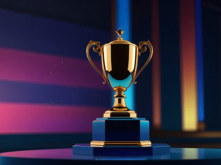 Glimmering golden trophy displayed against a dramatic blurred background in a well-lit setting