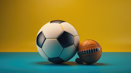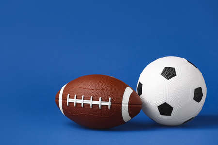 Soccer ball and football on yellow and blue background with copy space