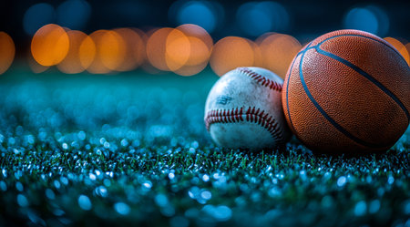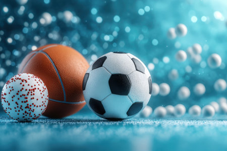 Three different sports balls are creatively displayed on a glittering surface, with soft, colorful lights providing a festive atmosphere. The scene captures the essence of sports and celebration.