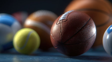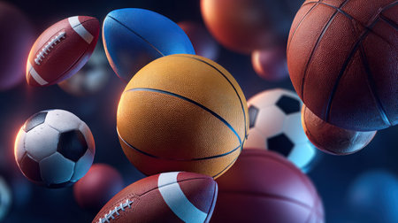 Various sports balls, including basketballs, footballs, and soccer balls, are depicted against a dark backdrop. The composition showcases a variety of shapes and textures, with dynamic lighting enhancing the three-dimensional appearance. Suitable for commercial projects or editorial content related to sports and recreation.