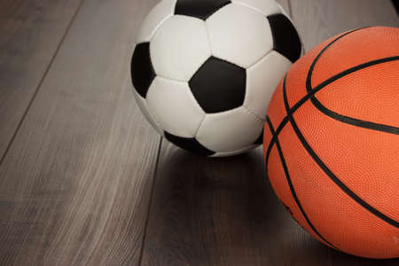 soccer ball and basketball on the brown wooden table