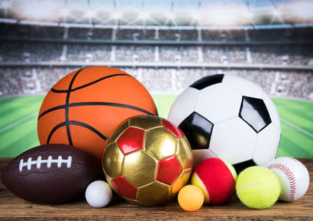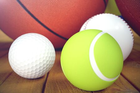 3d rendering sport balls on wooden backgorund. Set of sport balls. Sport equipment such us football, basketball, baseball, tennis, golf ball for team and individual playing for recreation and improve health.