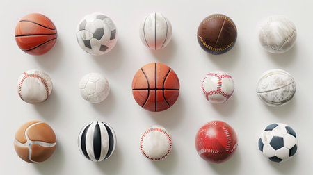 Close-up image showcasing a variety of sports balls, including basketball, baseball, and soccer ball, on a light surface. The high-detail textures emphasize cinematic sports symbolism.