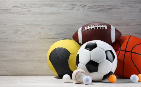 A vibrant collection of various sports balls and equipment arranged on a rustic wooden surface, showcasing the spirit of athleticism and teamwork. Perfect for fitness and sports-related themes.