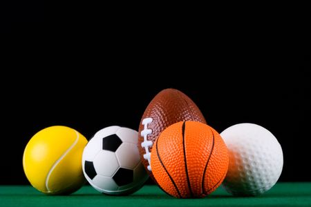 Miniaturized sport balls over black background. Shallow depth of field. Focus is on the front.