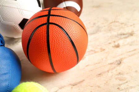 Team sport balls, top view. Sport games background.