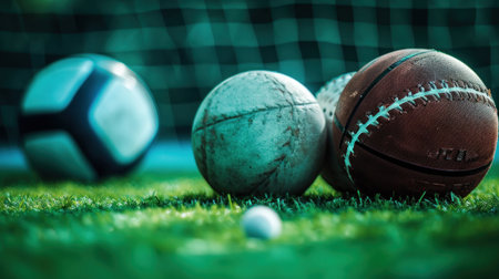 Closeup of different sport balls lying on green grass